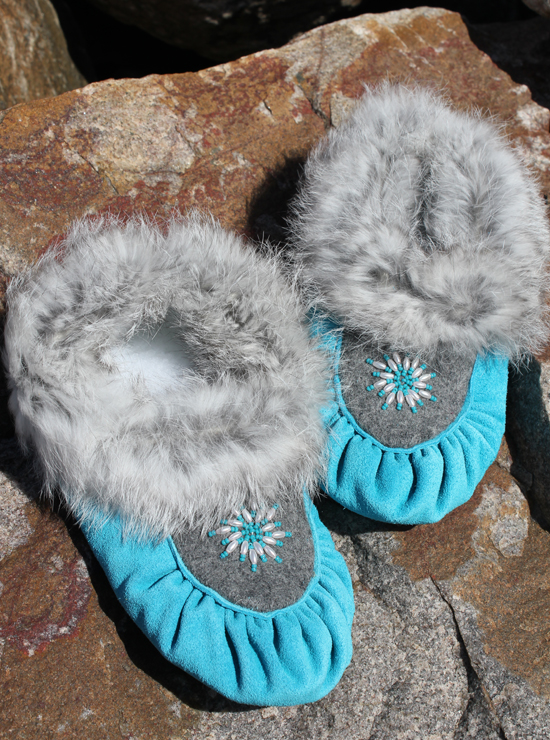 These beautiful moose-suede moccasins are hand crafted in Labrador by Innu artisans. Each is lined with fleece, trimmed with rabbit fur and hand beaded and each is one of a kind! Order your true shoe size for the best fit.