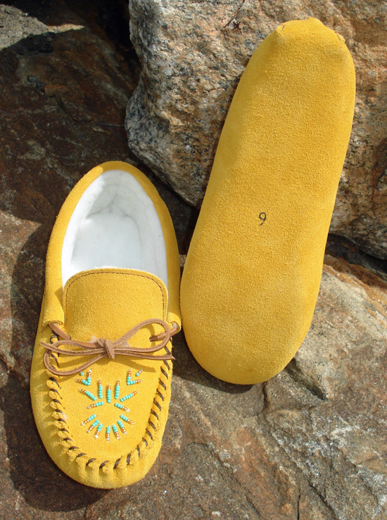 This suede moccasin is a classic! Perfect for cool mornings and evenings, the fleece is cozy and warm. Turquoise and gold beads add style and the lace ties for the perfect fit. Note that this style is a narrow fit. Crafted on Huron territory in Quebec.