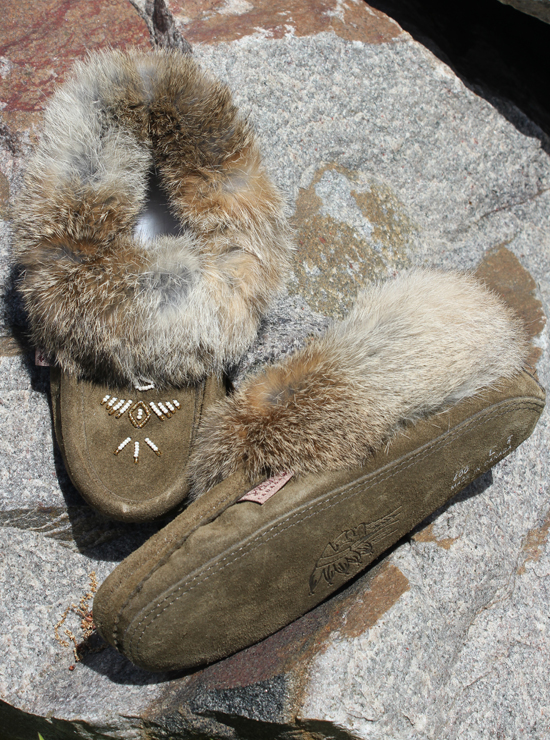 Another new colour in our line of fleece lined, and fur trimmed moccasins! Army green suede is trimmed with white and gold beads and brown rabbit fur. Cute and cozy! Now available up to size 12.