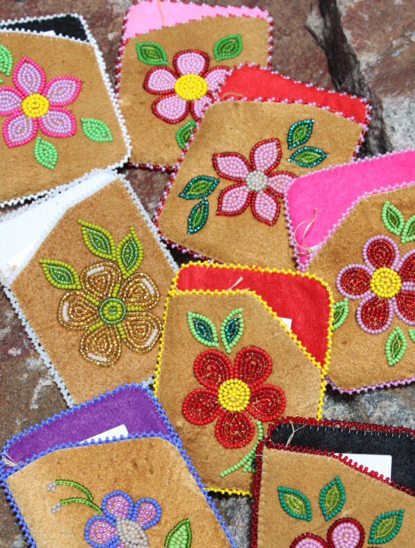 These cases are designed to hold credit and debit cards. They are crafted by Dene artisans in Fort Liard, NWT, of traditionally smoked tanned moosehide. The beadwork is gorgeous and each is a one of a kind piece. They measure 4.25″ x 3″ (11 cm x 8 cm).