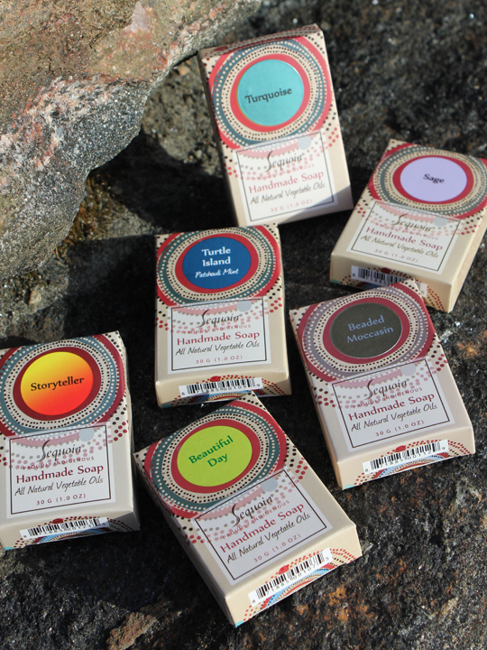 Soap | Sweetgrass, Cedar, Medicine Woman, Cradleboard, Beautiful Day, Storyteller, Turtle Island, Beaded Moccasin, Sage, Turquoise, Northern Blueberry, Moon Dance, Seven Dancers, Jingle Dress |