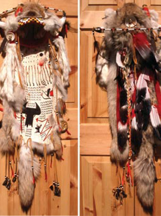 This elaborate horned bonnet is made from many animals, the spirits of which are transferred to the wearer. The brush wolf skin represents a good hunter and provider, the deer hooves are traditional ceremonial dance bells and the feathers reflect the hunting prowess of certain birds. A medicine pouch is also attached containing herbs and a talisman to protect the wearer. The inside of the hide is painted with imagery depicting the Battle of Batoche, May 1885, fought between the Northwest Mounted Police and Metis, Dakota Sioux and Cree forces. A full description is included. Dimensions: 52″ (130 cm) total length.