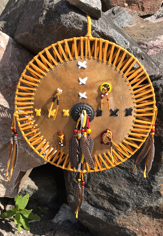 This beaded medicine wheel is crafted by Huron artisans in eastern Quebec. The four traditional colours are featured on the rawhide medallion, and the piece is finished with beads, carvings, feathers and a bear claw. Measures 16″ in diameter (40 cm).