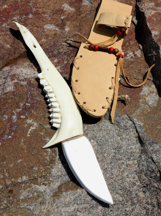 This is another in our collection of unique knives by Huron craftsmen in Quebec. This one features the jaw of a deer and the functional blade is crafted from vintage saw blades. The knife measures 12″/30 cm long.