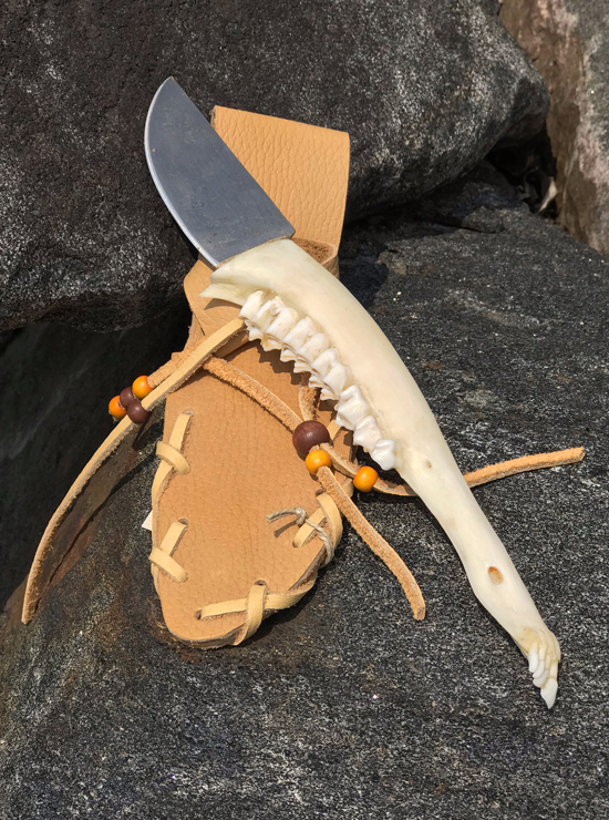 This very unusual knife was crafted by a Huron artisan in Quebec. A moose jaw forms the knife handle and the sheath is made of moosehide. What a great addition to a knife collection! Total length (blade and handle) is 22″/55 cm.