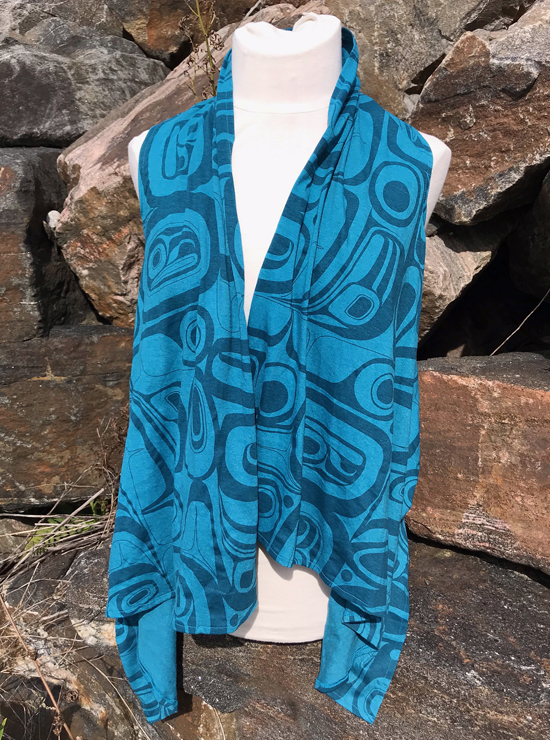 We love this vest! The all-over print is available with either the Raven or Whale design, both by Nootka artist Kelly Robinson. Made of a 60% cotton/40% poly blend, they wash well and one size fits all. Dress up a pair of jeans or leggings – you will get compliments!