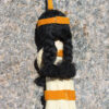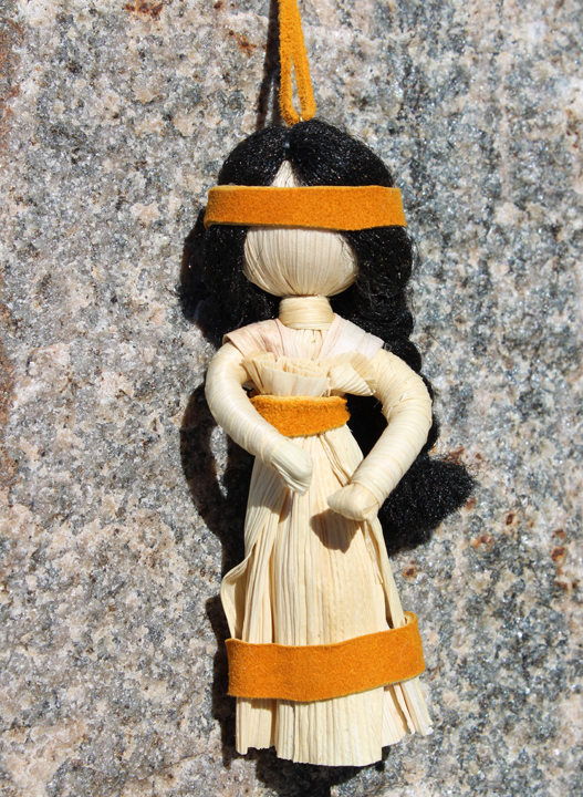 Crafted of corn husk, leather and yarn, this small cornhusk doll can be hung from a rear view mirror or crib. It is said that corn has a spirit that loses its home after the final harvest. Using the husks to create dolls and other items invites that spirit into the home over the winter, to be returned to the earth in the spring for the next crop. This dolly, crafted in Ontario by Mohawk artisans measures 4.5″/11.5 cm high.