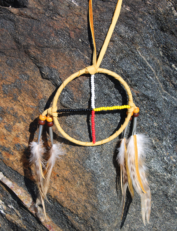 Crafted in Ontario by Mohawk artisans, this medicine wheel (representing harmony and connections) is crafted of deerskin, glass and wood beads and feathers. The hoop measures 4″/10 cm in diameter and it is 9″/23 cm long.