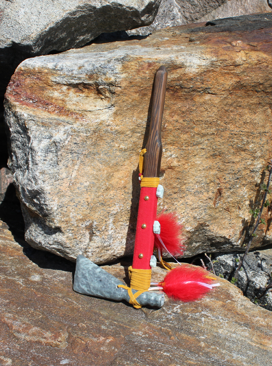 This working soapstone pipe was crafted by a Mohawk artisan in Southern Ontario. The soapstone bowl takes the form of a tomahawk, and the wooden stem is decorated with soapstone turtles, felt, feathers and fringes. Measures 17″/43 cm long.