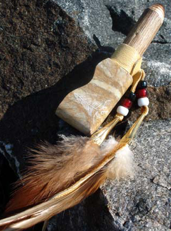 Seneca artisan Standing by the Bridge crafts these small pipes. The working pipe features a wood stem, soapstone bowl and feather decoration. Measures 5″ (13 cm) long. Stone colour and design will vary.