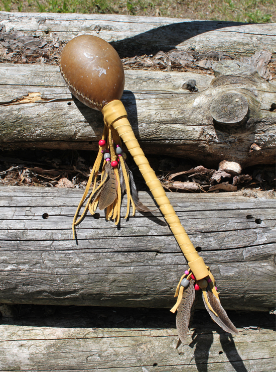 Shakers are an important element in Native ceremonies. Their soft sound calls to the ancestors and summons them respectfully for their assistance. This rawhide shaker was crafted in Quebec by Huron artisans, and is decorated with beads, feathers and fringes. Bead colour will vary. Measures 17″/43 cm long.