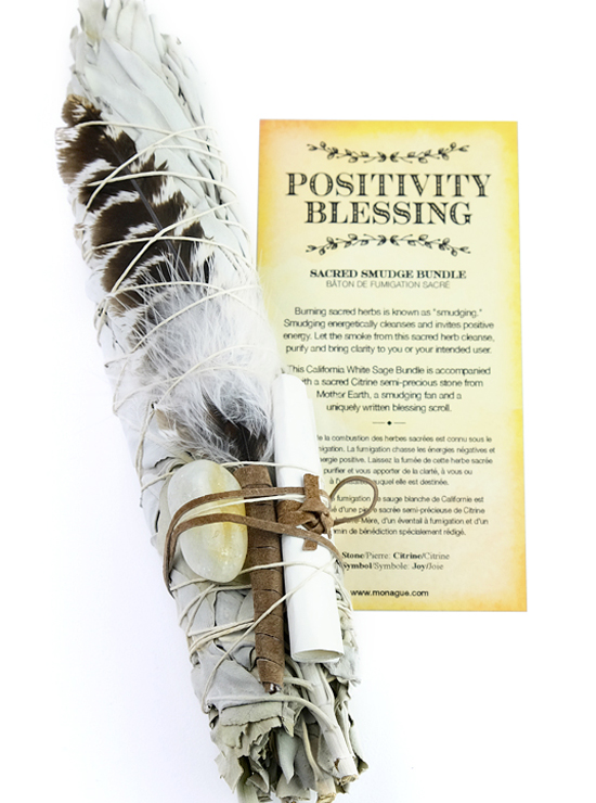 Each White Sage Blessing Smudge Bundle is accompanied with a sacred polished semi-precious stone from Mother Earth, together with a natural smudging feather, a uniquely written blessing scroll and smudging directions. Choose from among 4 blessings. Sage bundle measures 9″/24 cm and each comes packaged in a beautiful organza bag.