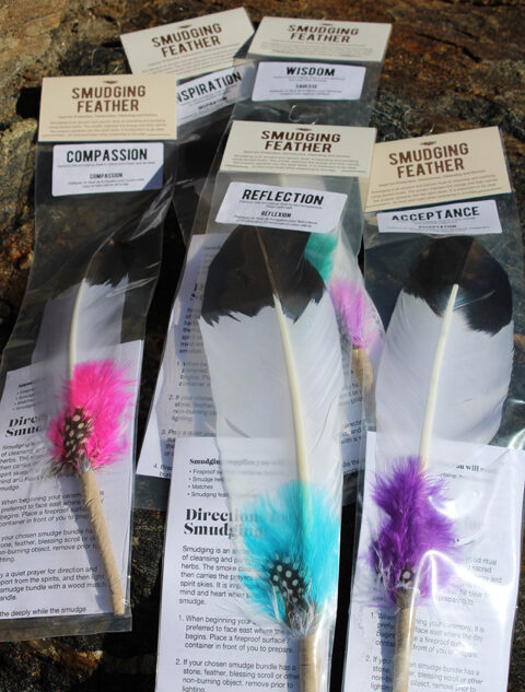 Smudging is an ancient and sacred ritual of cleansing and purification. The smoke cleanses the energy and then carries the prayers upwards into the spirit skies. It is important to be clear of mind and heart when preparing to smudge. Use these feathers to focus your thoughts. Each feather comes assembled in a bag with smudging directions. Feather length ranges from 10 to 11.5 inches (25 cm to 29 cm).