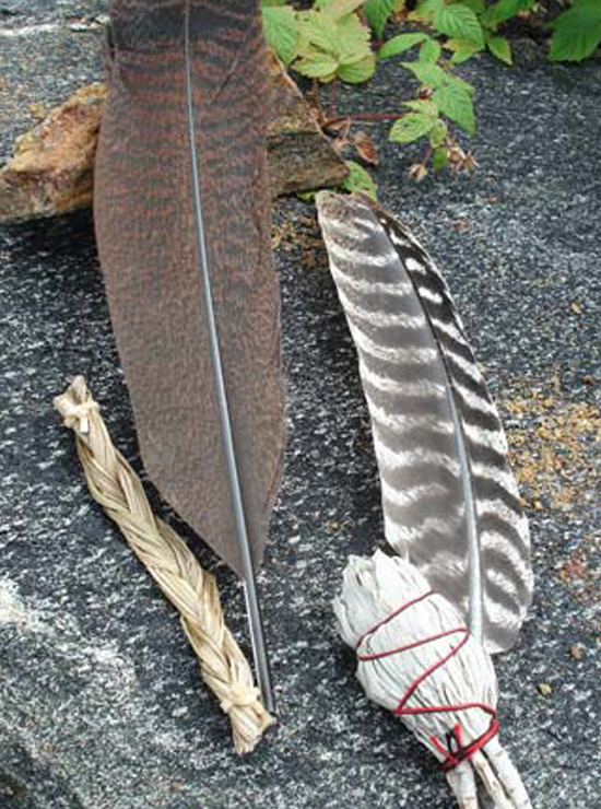 The history of smudging in Iroquois culture goes back centuries. A pot was fashioned from stone or abalone shell, and sacred medicine (sweetgrass, sage, cedar or tobacco) was burned in this pot. The smoke was then waved by hand or with a large feather, and inhaled as a ceremonial cleansing of the spirit. Choose either the turkey feather with a sage bundle or sweetgrass braid. Feathers will vary.