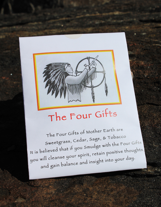 The Four Gifts of Mother Earth are sweetgrass, sage, cedar and tobacco. It is believed that if you smudge with the Four Gifts, you will cleanse your spirit, retain positive thoughts and gain balance and insight into your day. The pouch contains 5 grams (.15 ounce) of the Blend.