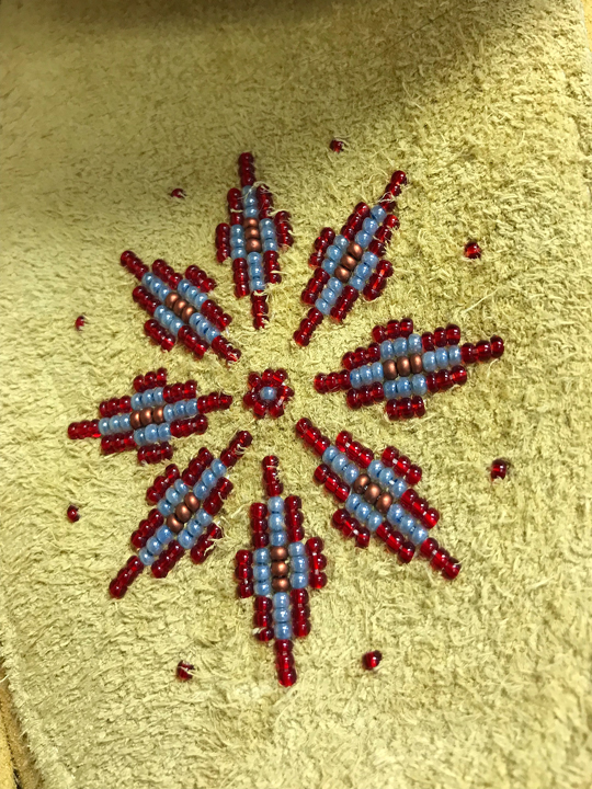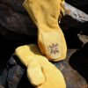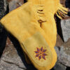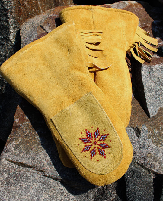 These are crafted by Cree artisans in Churchill, Manitoba. The moosehide is fringed, beaded and lined with a cozy fleece. Available in Ladies Large only, as shown.
