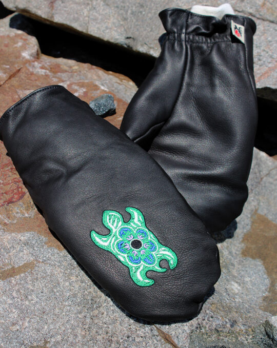 These mitts are crafted of black deerskin and feature a removeable synthetic fleece lining that will keep you warm to -35’C / -31′ F. The striking turtle is embroidered, and is the result of a collaboration with the Wilson Sisters – a Mohawk artist group from southern Ontario.