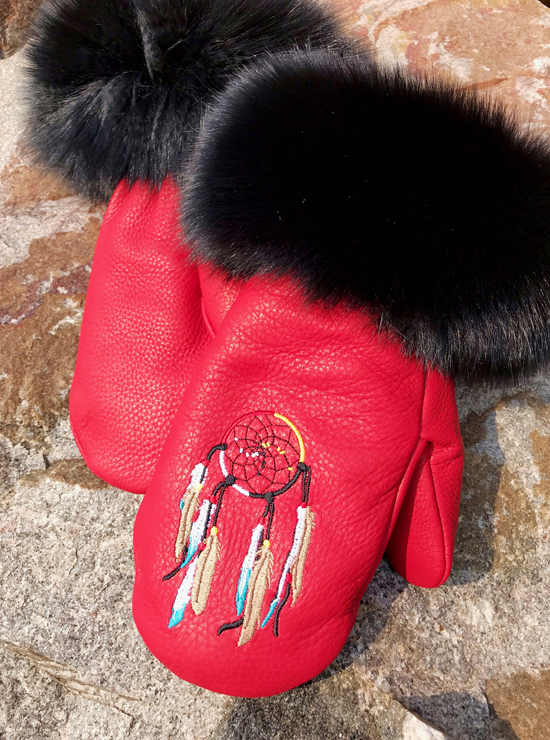 Crafted in Ontario, these mitts are rated to-35° C. The deerskin is soft and buttery and who doesn’t love a shot of red in the winter? The acrylic liner is topped with genuine fox fur for a luxurious touch. The embroidered medicine wheel/dreamcatcher is the design of Anishinabek artist Stephanie Bryenton…gorgeous! They measure approximately 12″/30 cm long.