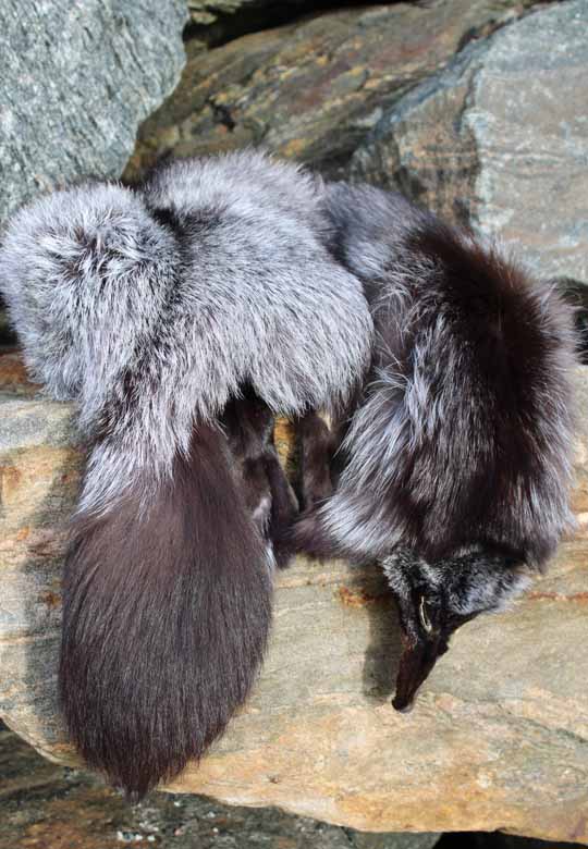 This silver fox fur is very plush. The tail and feet are chocolate brown and the fur is beautifully marked. This pelt has been cased, meaning it has not been cut open underneath. More photographs are available upon request. Measures 43″/109 cm long.