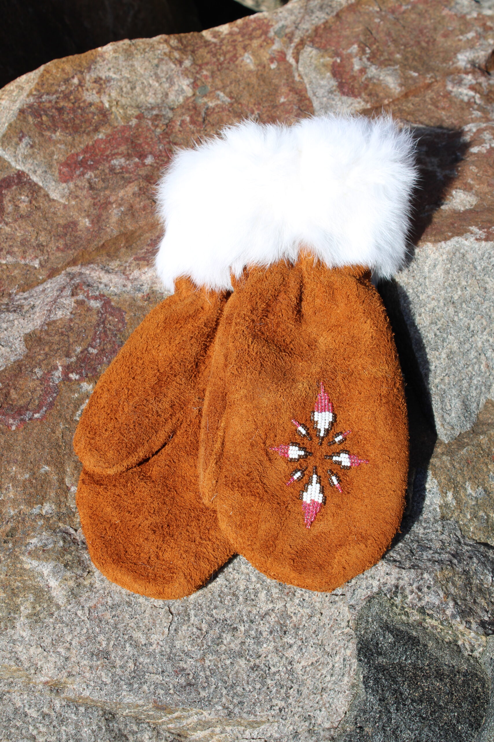 These are crafted of deerskin in northern Ontario by an Ojibway artisan. Each pair is beaded, lined with a cozy fleece and trimmed with rabbit fur. These are size medium/large only.