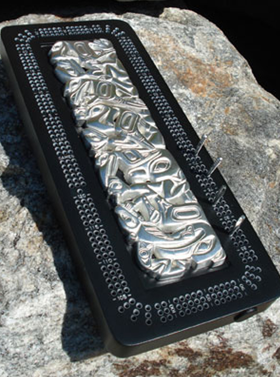 You won’t want to put this cribbage board away between games! The raised pewter design is based on traditional Haida images and the board is made of a composite designed to look and feel like argillite, a stone used for carving and found only on the Queen Charlotte Islands (Haida Gwaii). Pewter pegs are included. Dimensions: 11″ (28 cm)L, 5″ (13 cm)W, 1″ (2.5 cm)H