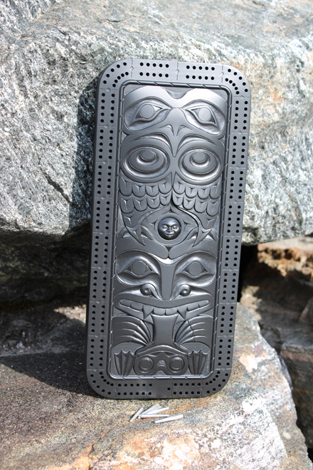 Crafted in Canada, and based on a carving by Mark Garfield, this cribbage board looks good enough to leave out all the time. The black finish replicates argillite, a stone often used by Haida artists on Canada’s west coast. Pewter counting pegs are included. Measures 12″ x 5″ (30 cm x 12 cm)