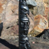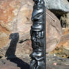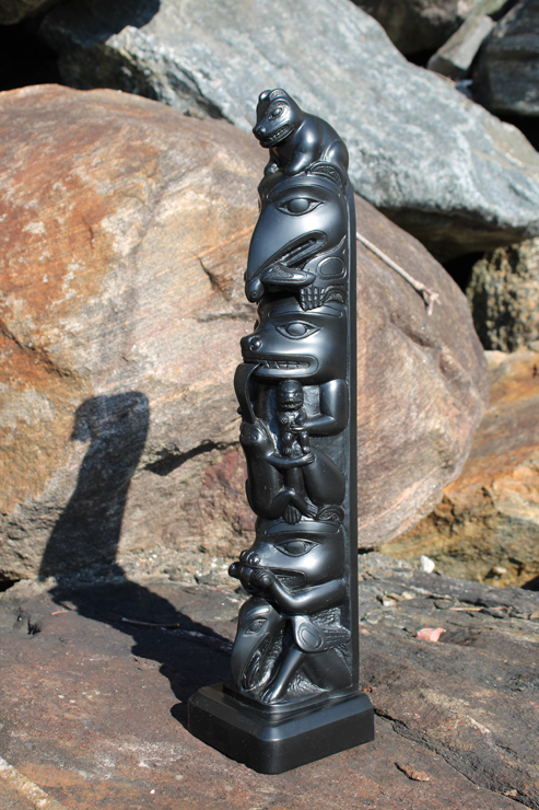 Haida artist Isaac Chapman carved model totem poles over 100 years ago. His poles were carved of argellite, a black slate found only on the Queen Charlotte Islands (Haida Gwaii). This pole, made of a composite designed to look and feel like argellite, replicates one of his famous carvings. Dimensions: 4″L, 4″W, 20″H (10 cm x 10 cm x 50 cm). Due to its weight and size, additional shipping charges will apply, please enquire.