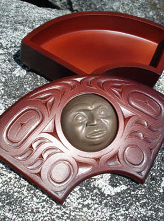 Made of recycled glass box, this fan shaped box with a bronze moon mask, was created by west coast artist Mark Garfield. Born and raised on the West Coast of British Columbia, he developed an interest in carving at an early age copying totem poles and masks that inspired him throughout his youth. Mark’s work reflects a contemporary approach to traditional northwest coast art influences which have shaped his carving style. Measures 7″ x 4″ (18 cm x 10 cm).