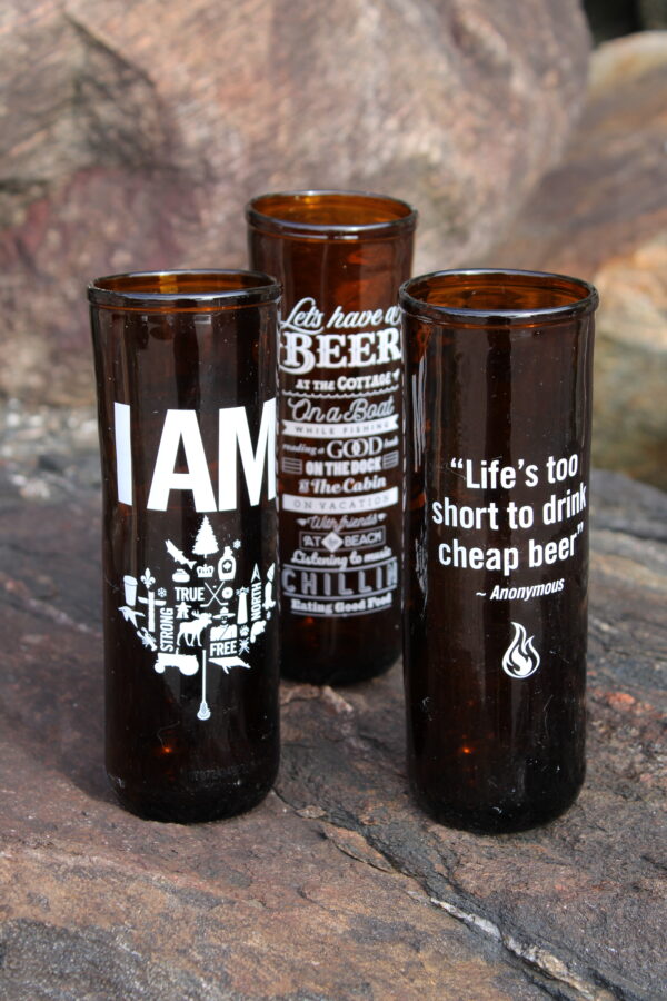 Crafted in Canada of upcycled beer bottles, these are sure to be conversation starters! Dishwasher safe, they measure 8″ x 2.5″ (20 cm × 6.5 cm). Holds a full beer.