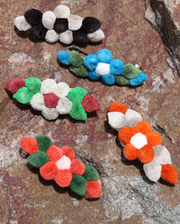 These stunning barrettes are crafted by Cree artisans in Churchill, Manitoba. They feature fully tufted floral designs – what a beautiful way to accessorize! Measures 3″/7.5 cm long.