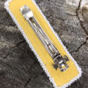 This barrette features the national image of the Haudenosaunee. It records the five original nations of the Confederacy and their agreement to live together in peace. The central symbol is a tree and represents the Onondaga Nation. It was in the Onondaga Nation that the Peacemaker planted the Tree of Peace and it was under that tree where the leaders of the Five Nations buried their weapons of war. The Hiawatha Belt forms the basis of the flag of the Haudenosaunee Confederacy. Measures 3.75″ x 1″ (9.5 cm x 2.5 cm).