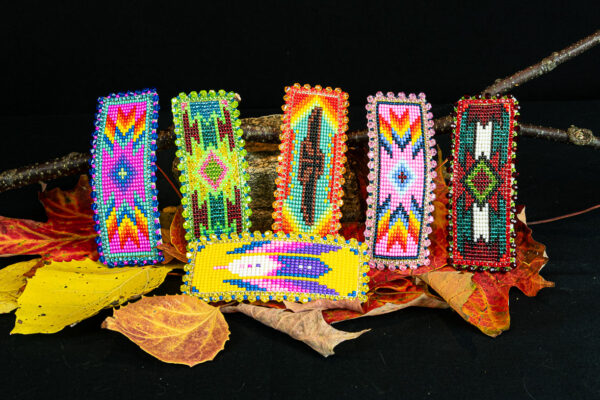 These barrettes will liven up your look. Crafted by a Cree artisan in Saskatchewan, each is unique – what a beautiful way to accessorize your hair. They measure 4″ wide x 1.5″ wide (10 cm x 4 cm).