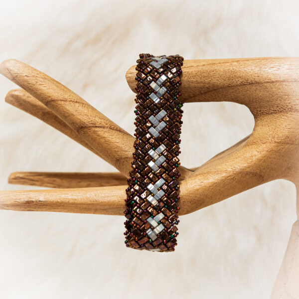 These beautiful bracelets are hand made of glass beads in Ontario. Choose either metallic bronze in a herringbone pattern or turquoise and white.
