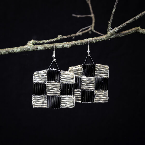 These earrings are crafted on the Attiswapiskat First Nation by a Cree artisan. They measure 1.5″ square (4 cm).