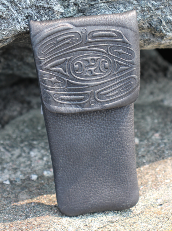 These eyeglass cases are crafted of butter soft deerskin. They feature an embossed raven design by Tinglit and Kwakiutl artist Corrine Hunt and are available in four vibrant colours. They measure 6.5″ x 3″ (17 cm x 8 cm), are cotton lined and sport a magnetic closure.