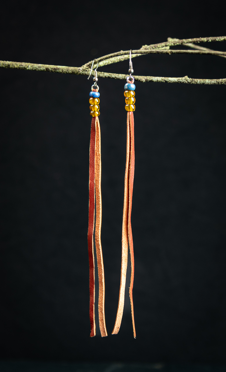 How fun are these? They weigh next to nothing but their impact is high. The earth tones of the leather are matched beautifully with the jewel toned glass beads. Each pair is unique.