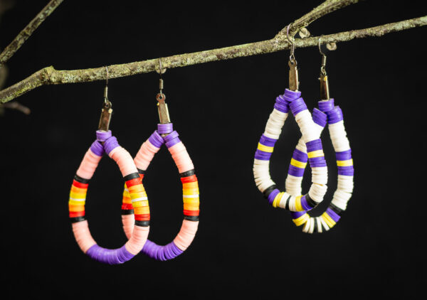 These are crafted on Manitoulin Island of Heishi beads. They are associated with protection, healing and connection to nature. The hoops are 2″/5 cm long, plus hook.