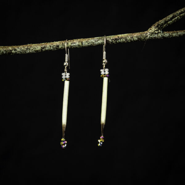 These delicate earrings are made of porcupine quills and beads. They are crafted by Ojibway artisan M. L. George of Curve Lake, Ontario and measure approximately 1.5″/4 cm long.