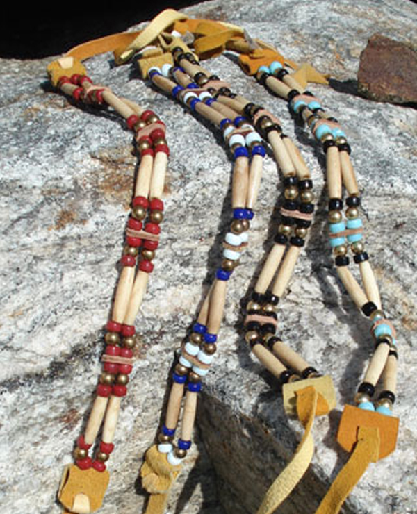 These Mohawk chokers are crafted of bone hair pipes in two rows. Brass beads, coloured glass accent beads, and a simple deerskin lace complete the look.