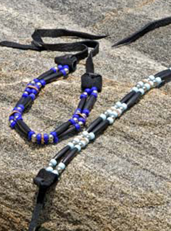 Two rows of black cow horn hair pipes make these chokers special. Each is accented with metal beads, and assorted glass beads. Crafted by Mohawk artisans in Southern Ontario.