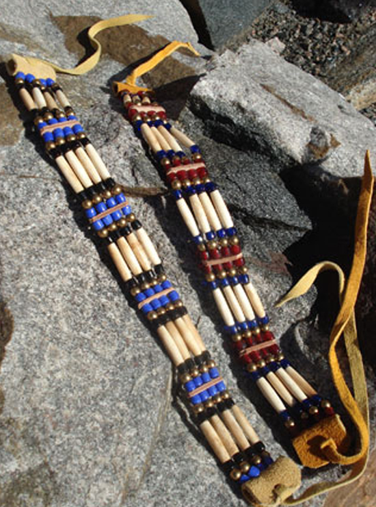 Four rows of bone hair pipes, with glass and brass beads form these chokers. Crafted by Mohawk artisans in southern Ontario. Other colours may be available. Indicate your preference under ‘comments’ in your order and we’ll do our best to accommodate you.