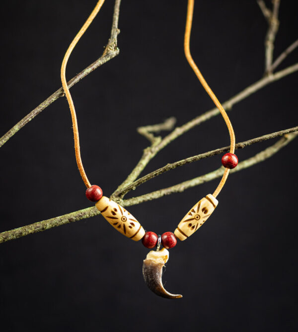 This necklace features a single wolf claw surrounded by beads on leather thong. Crafted by Huron artisans in Quebec, it measures 18″/45 cm long.