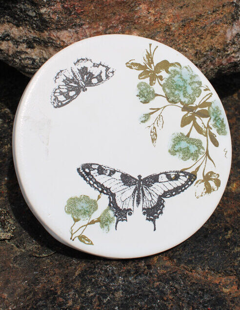 These lovely ceramic coasters have a vintage feel. Each measures 4″/10 cm in diameter and has three rubber dots on the underside to protect your surfaces. Handcrafted in Ontario!