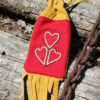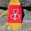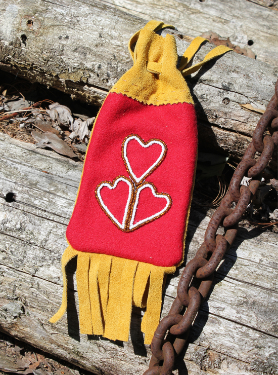 Styled after a traditional tobacco pouch, this moosehide bag was crafted in Curve Lake in Ontario. This suede bag features a felt panel, decorated with a hand-beaded heart design. A drawstring cinches the pouch closed, and can be tied to a belt or slung over the shoulder. Measures 4″ wide, 8 1/2″ plus fringe long (10 cm x 21 cm).