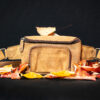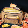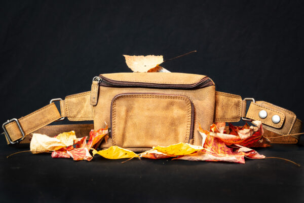 This is not the 1970s fanny pack! Crafted of buffalo hide, it features a zippered pouch on the front with slots for 2 cards and space for cash or other essentials. The main pouch is zippered, and has another zippered pocket within. There is a final zippered pocket on the back. The strap is adjustable and the buckle is sturdy; wear it cross body or traditionally. It looks great either way. It measures 8″ x 6″ (20 cm x 15 cm).