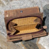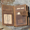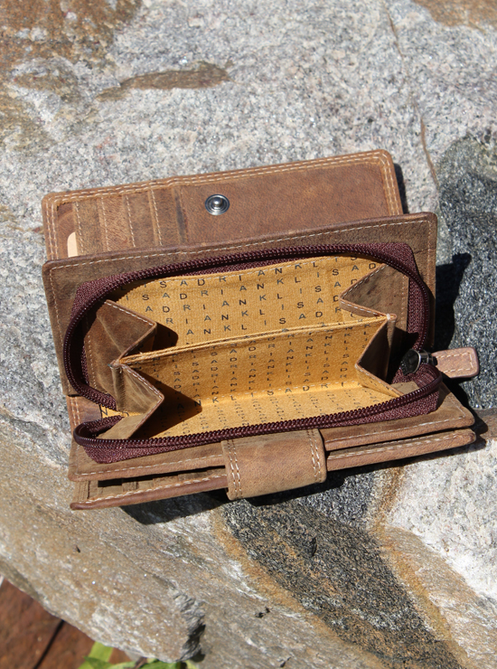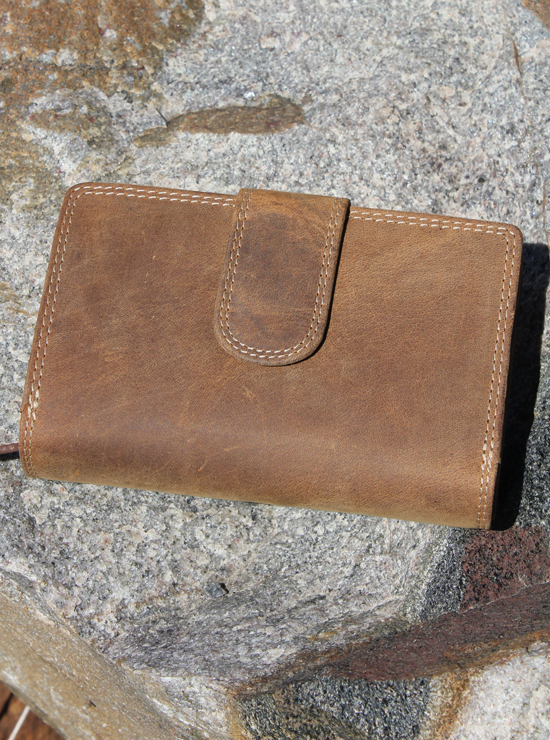 This wallet, crafted of buffalo hide, is incredible. It has two pockets for bills and receipts, slots for twenty two cards, and ID pocket and a zippered coin pouch with two compartments. Two snaps keep everything compact but easy to access. Measures 6″ x 4″ x 1″ (15 cm x 10 cm x 2.5 cm).