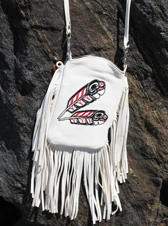 These are stunning! Crafted in Ontario of butter soft deerskin, they are the perfect size for your phone and one or two other essentials. A snap closes the bag at the top, two pockets in the back add even more space and the strap is adjustable. The best part is the embroidered feather image; designed by renowned Haida artist Eric Parnell. Gorgeous! They measure 7″ x 4″ (18 cm x 10 cm) plus fringes.