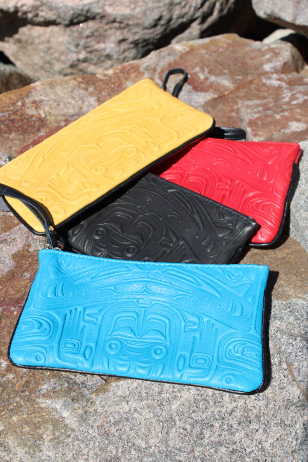 These deerskin ‘wristlets’ are the perfect size for your essentials. The Haida ‘bear box’ design is embossed on both sides and the zipper features a pewter pull for the final touch. Measures 7″ x 4″ (19 cm x 10 cm).
