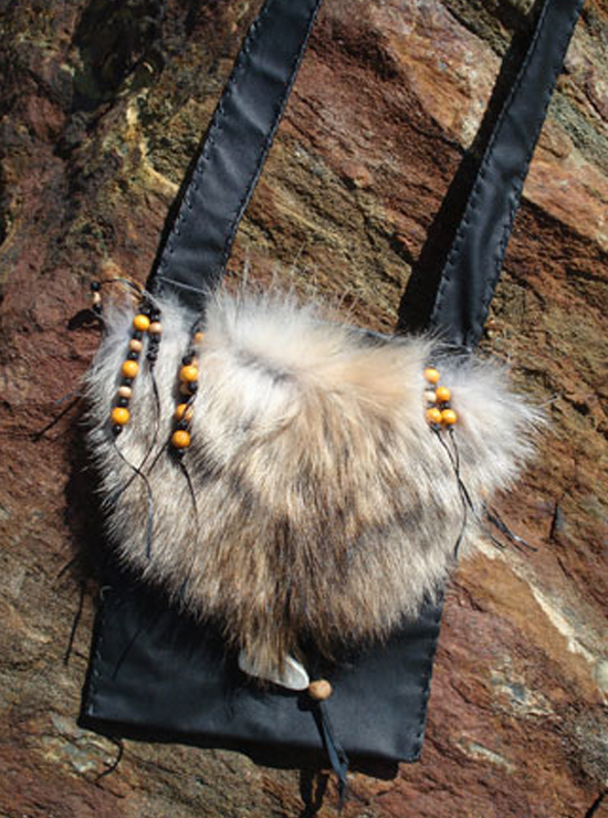 This leather purse has style. It features luxurious coyote fur on the flap, a button made of antler and fringes. The unlined bag measures 8″ x 7″ (20 cm x 18 cm). The strap is not adjustable and measures 36″/92 cm long.
