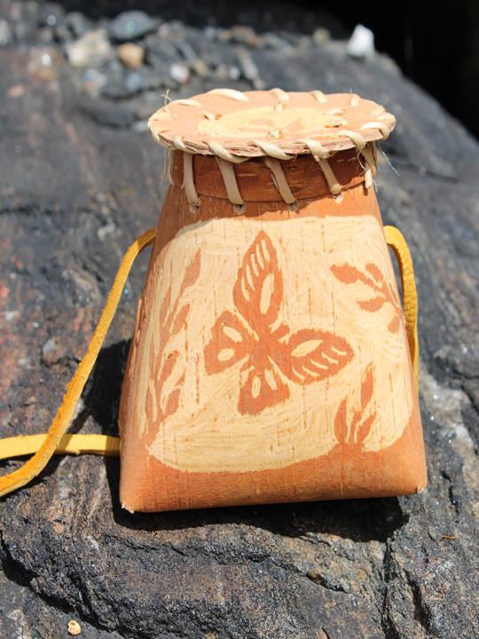 This lidded and etched bark basket was crafted by Atikamekw artisan Yvan Boivin. A truly impressive piece, it features the images of a loon, bear and wolf. It measures 4″ wide x 2.5″ long x 4.5″ high (5 cm x 11 cm x 11 cm).